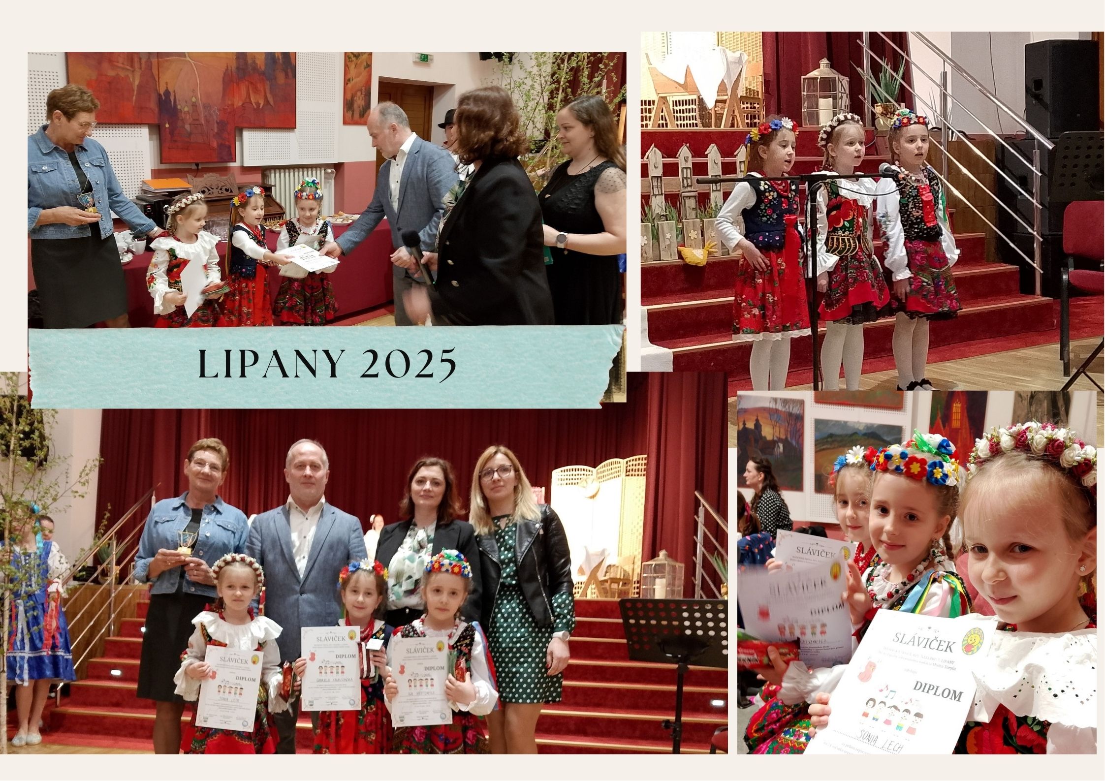 W dniu 24.04.2025 roku odbył się XXIV Festiwal Piosenki Ludowej Dzieci Przedszkolnych "Slavicek" w Lipanach. W tym roku nasze przedszkole reprezentowały dziewczynki z grupy VI: Iga, Sonia i Gabriela, które ubrane w piękne stroje ludowe zaprezentowały piosenkę "Hej na krakowskim rynku". Piosenka wykonana została z ogromnym zaangażowaniem i niepowtarzalną prezentacją artystyczną. Dziękujemy za piękne doznania artystyczne i radosną atmosferę podczas festiwalu.To piękna tradycja wieloletniej współpracy polsko - słowackiej z zaprzyjaźnionym przedszkolem w Lipanach.