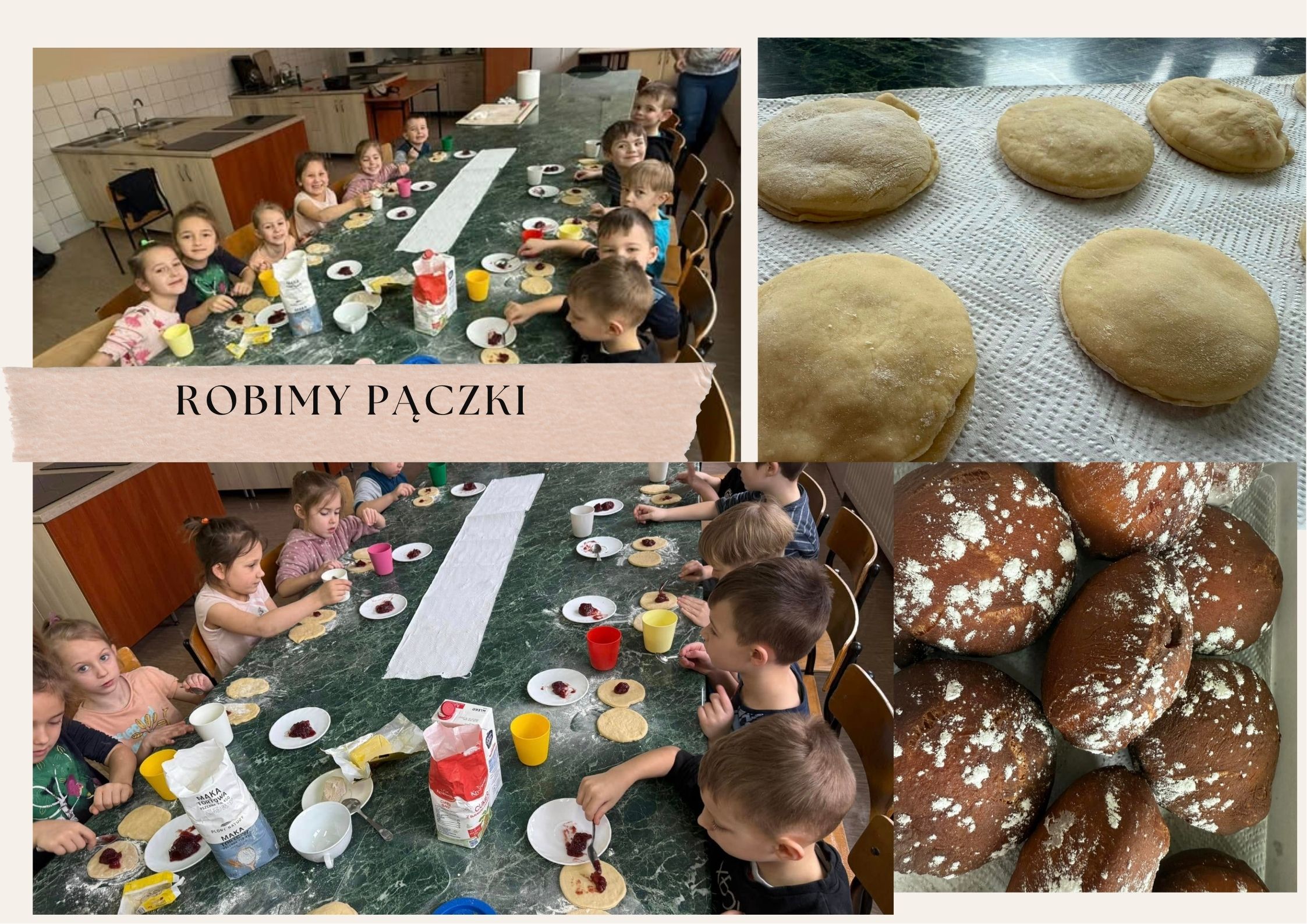 W dniu 28 lutego dzisiejszym dzieci z naszej grupy wzięły udział w zajęciach cukierniczych podczas których nauczyły się robić pączki.Na początku zadbaliśmy o higienę myjąc rączki a później zabraliśmy się do pracy w pięknej sali gastronomicznej w naszej ZSP Szkole w Muszynie. Omówiliśmy jakie składniki będą nam potrzebne i jak powstaje ciasto. Gdy już było gotowe dzieci samodzielnie formowały pączki.Przyznam szczerze że zdolni z nich cukiernicy. Później Pani usmażyła dwa, tak aby dzieci widziały cały proces ich powstawania.Kiedy Pani Jasia zaczęła smażyć pączki my wybraliśmy się na mały spacer po szkole, tak aby poznać jej salę i zobaczyć jak wygląda. Dzieci były w bibliotece, w klasie lekcyjnej gdzie uczyły się dzieci. Kiedy wróciliśmy do sali gastronomicznej paczki były już usmażone i ostygnięte dzięki czemu mogliśmy przystąpić do DEGUSTAACJI.