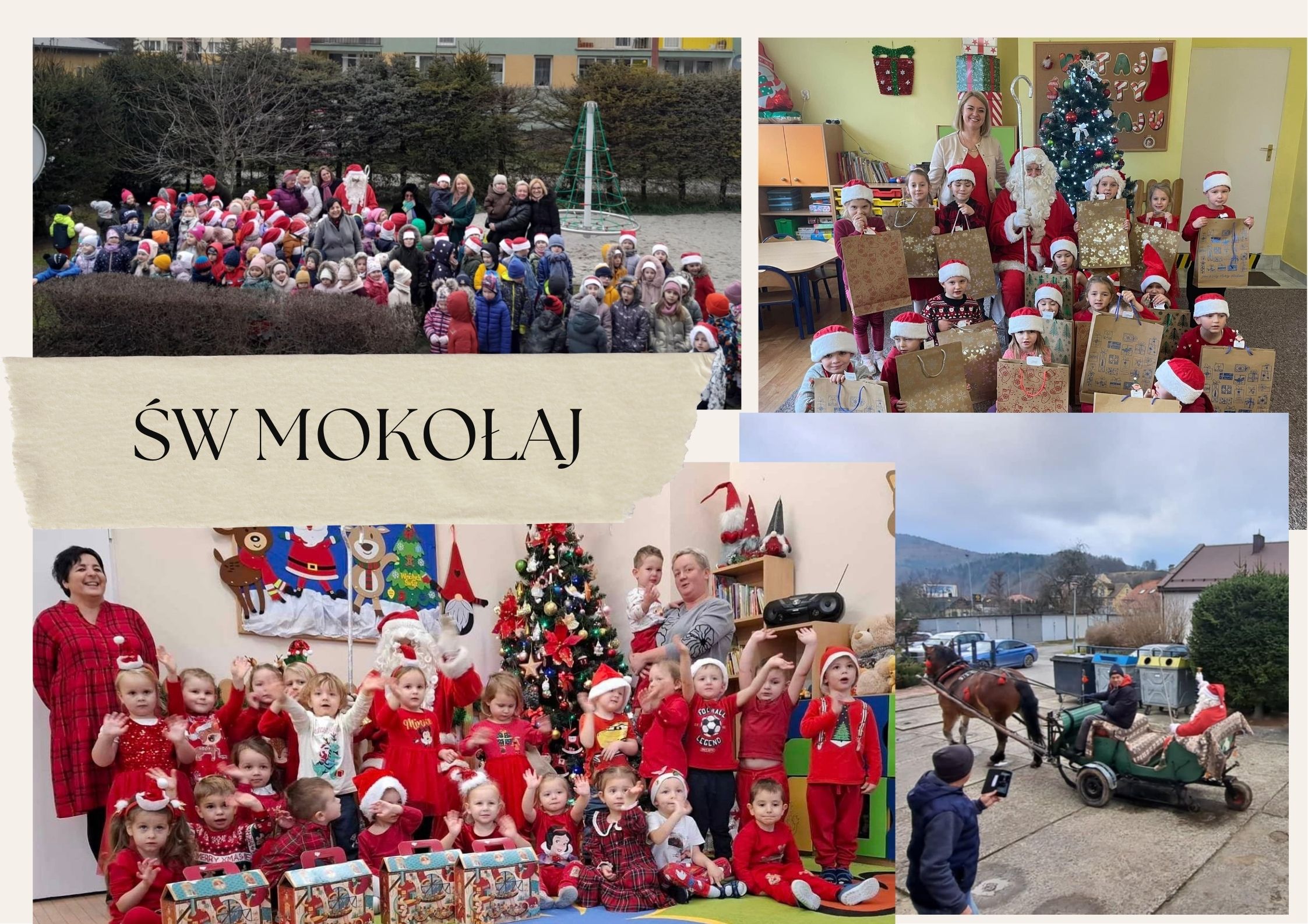 Ho, ho, ho – czy tu są grzeczne dzieci? Tak przywitał przedszkolaki nasz wyjątkowy Gość – Mikołaj, który dotarł do naszego przedszkola saniami. W ogrodzie powitały go oczekujące dzieci. Emocjom nie było końca, ale wcześniej ogromne zaskoczenie, które można było zobaczyć na buźkach dzieci i fascynacja , że Mikołaj przyjechał saniami. Nie wszedł przez komin, nie zostawił prezentów w skarpecie przy kominku lub pod poduszką, ale przyjechał prawdziwymi saniami. Przedszkolaki po wspólnym odśpiewaniu piosenki zaprosiły Mikołaja do przedszkola, gdzie wręczał im prezenty.