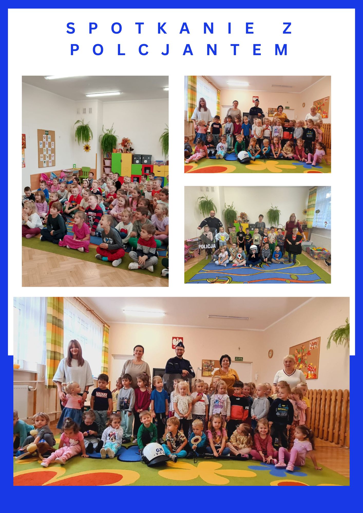 11 października przedszkolaki gościły u siebie Pana Policjanta z posterunku Policji w Muszynie. Celem spotkania było zapoznanie dzieci z ogólnie pojętym pojęciem BEZPIECZEŃSTWA na drodze, w kontaktach z osobami obcymi, dziecko samo w domu, bezpieczeństwo na placu zabaw. Pan Policjant przybliżyli dzi eciom specyfikę swojej pracy. Zwrócili uwagę na ważne alarmowe numery telefonów, pod które można dzwonić w razie potrzeby. Dzieci zapoznały się z umundurowaniem Policjanta oraz akcesoriami, których używa Policja (kajdanki, pałka, tarcza, kamizelka kuloodporna, lizak).