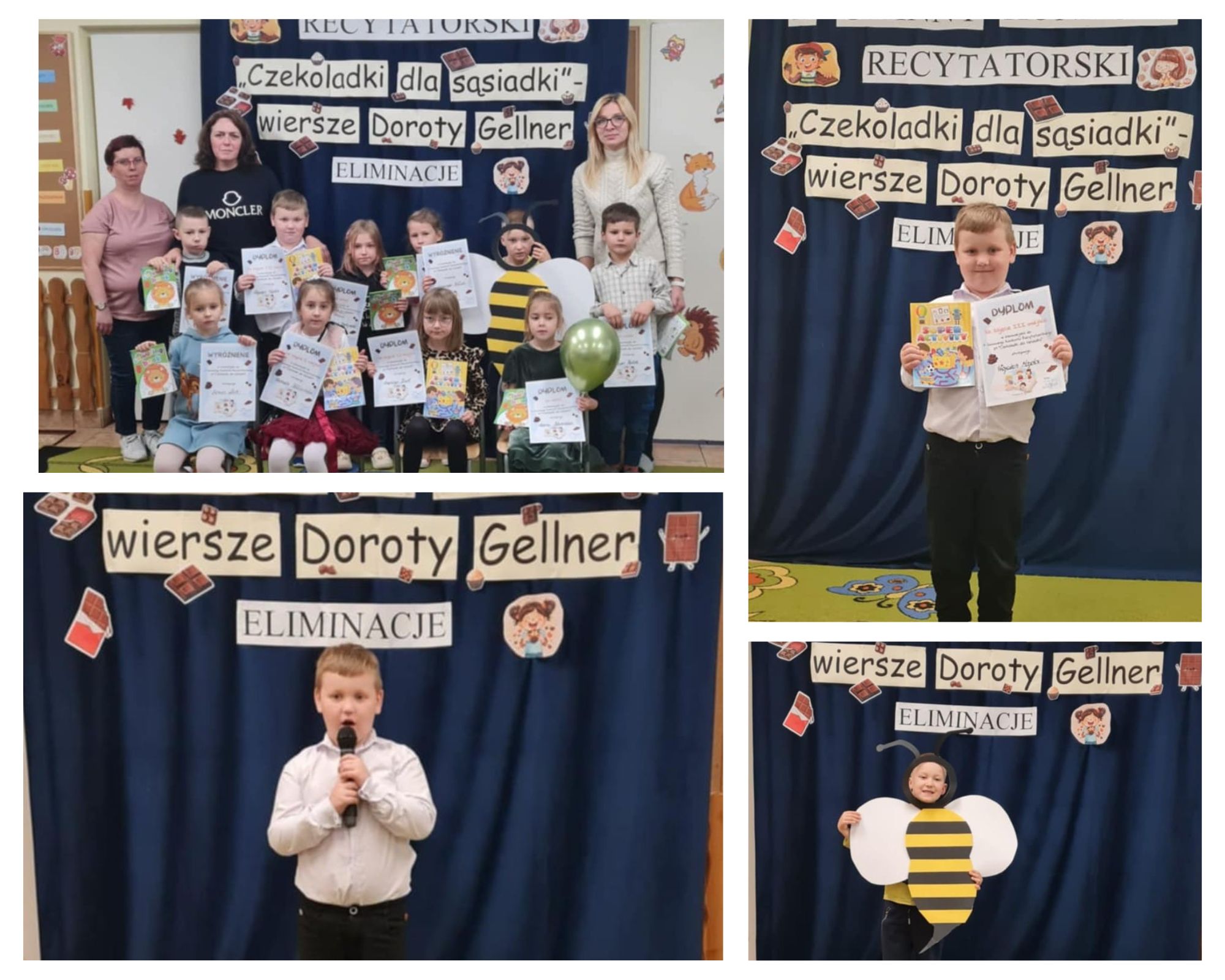 W poniedziałkowy ranek, 4 listopada w naszym przedszkolu odbył się przedszkolny etap X Gminnego Konkursu Recytatorskiego. pt. "Czekoladki dla sąsiadki”- wiersze Doroty Gellner. Nie było łatwo wyłonić zwycięzców, ponieważ wszystkie przedszkolaki reprezentowały naprawdę wysoki poziom. Podziwiamy odwagę oraz zdolności aktorskie. Składamy również serdeczne podziękowania rodzicom, którzy włożyli wiele trudu w przygotowanie dzieci do występu. Wszyscy uczestnicy konkursu otrzymali nagrody książkowe i dyplomy.